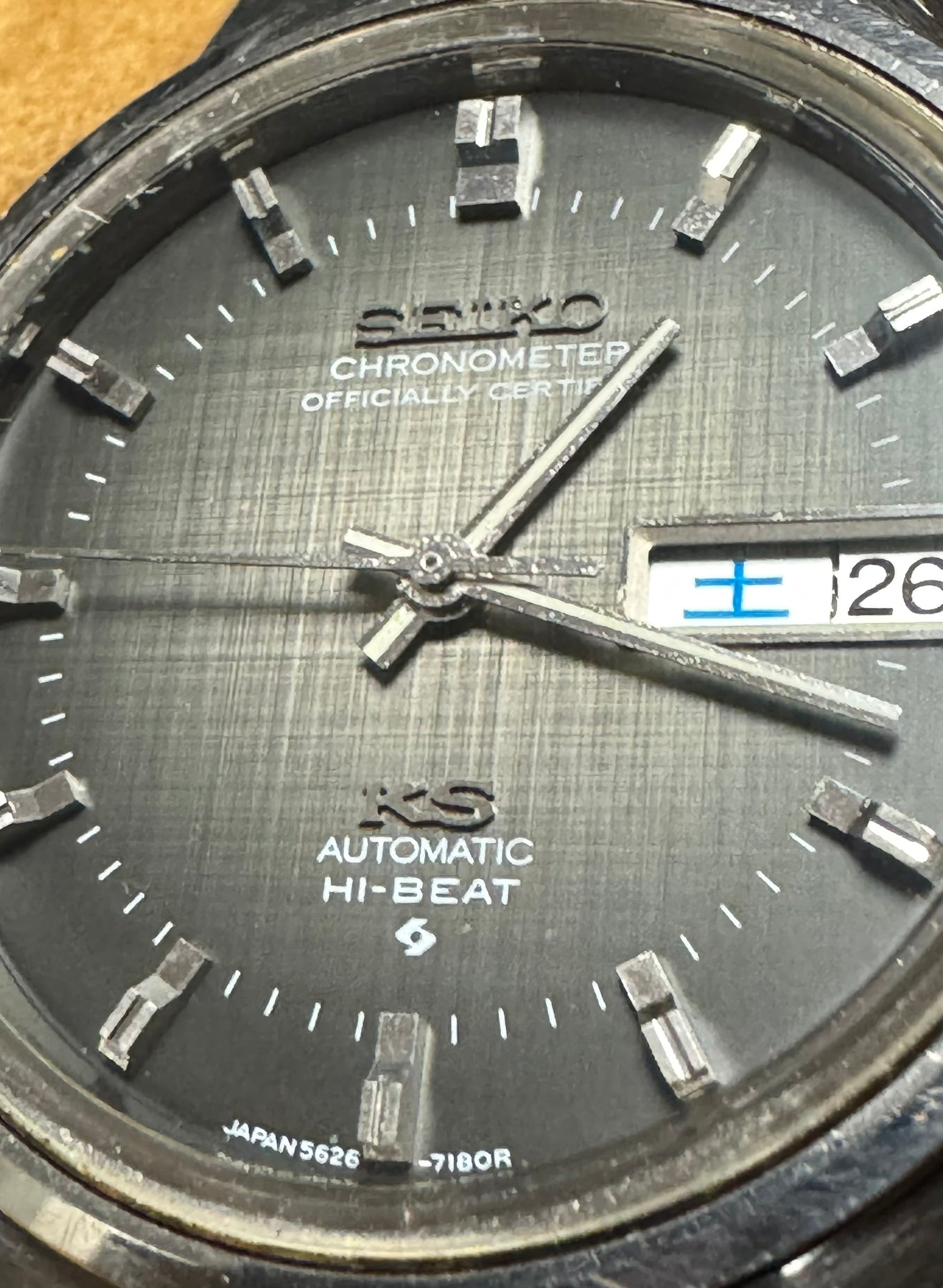 This King Seiko 5626-7170 is in outstanding condition. The movement has been serviced and runs with excellent accuracy, fully functioning in all modes. The case shows only minimal signs of use, and the integrated bracelet is in similarly clean condition. The dial is beautifully preserved with a crisp linen texture and strong printing. A new crystal has been fitted to enhance legibility. With its combination of high-beat precision, chronometer status, and original parts, this is a highly collectible piece of Seiko’s mechanical legacy.