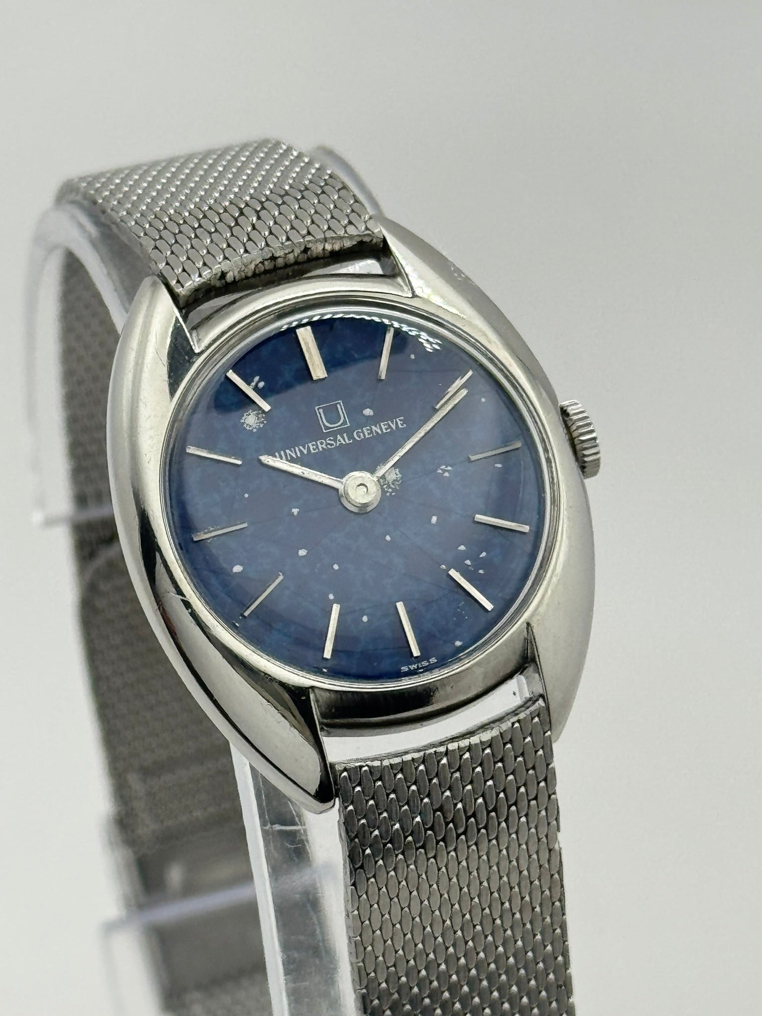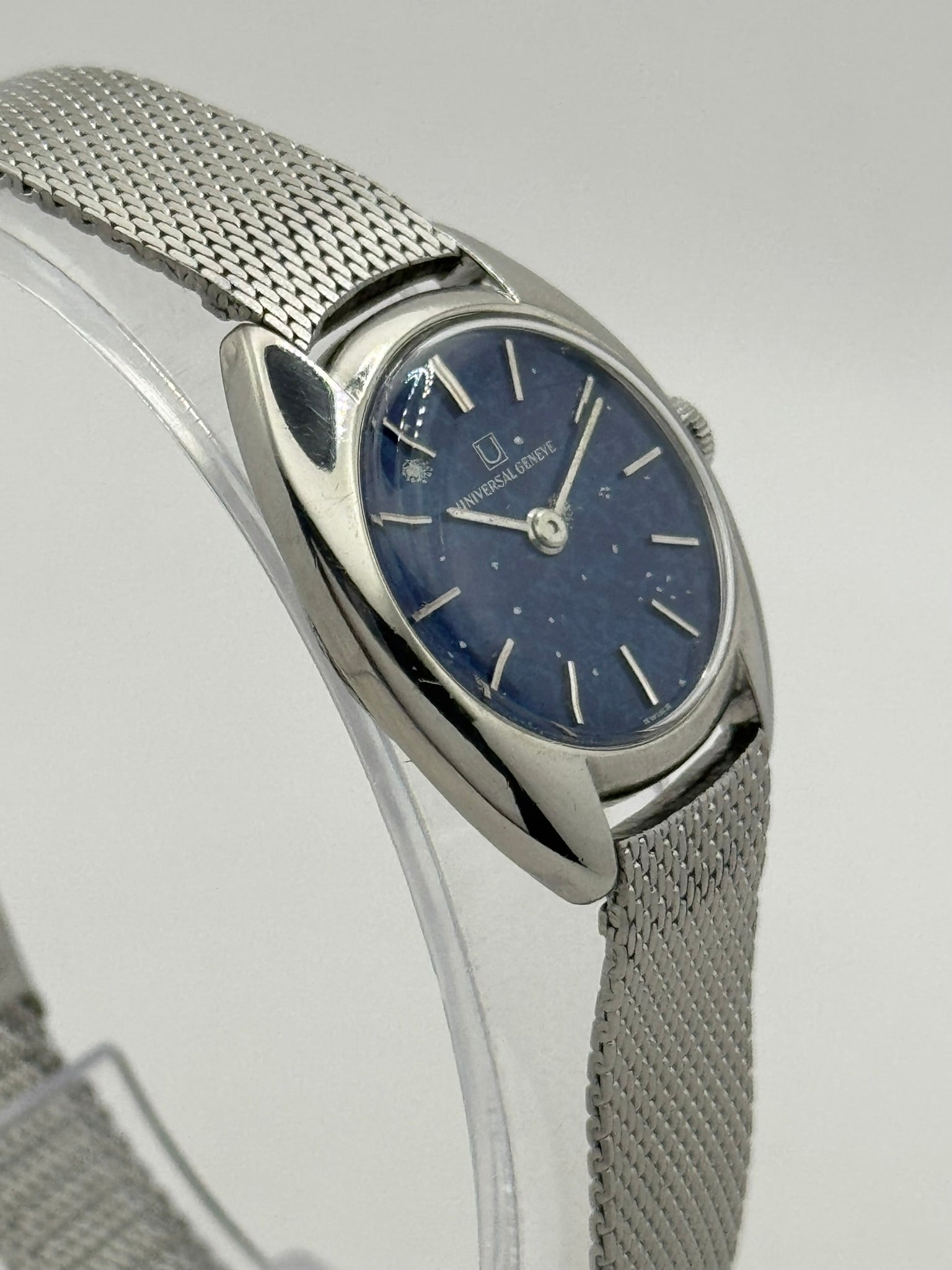 This particular example features a striking lapis lazuli “spiderweb” dial, where natural mineral veining creates a distinctive web-like pattern across the deep blue stone surface. Combined with the elegant stainless steel case and original bracelet, it represents a beautiful example of Universal Genève’s refined ladies’ watches from the period.
